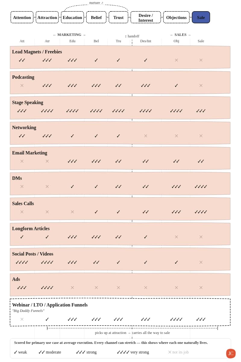 It's all super clear right? Wrong. When a business owner decides they need to do marketing and sales activities, overwhelm ensues. Which platforms? How often? How long will it take? How much money will I expend? Which type of content? This leads to an expensive, exhausting, spray and pray method. And when that happens, there are inevitable gaps in your line. Maybe you're really good at longform articles (the education > belief > trust loop), but you never run ads or do anything to get attention so you sit in obscurity for a long time. You determine the longform articles are useless. Or, perhaps you're really good at reels and IG, and you have followers, but you lack any true automated funnel so you amass people who never make it past attraction or maybe they get all the way to trust but never do anything more. Or, let's say you have a great podcast (education, belief, trust), and you also have a great sales call script, but you're missing the bridge for podcast listeners to make it to your calendar. Sometimes you have everything in the line, but they are disconnected from each other. I sketched out my analysis of the different marketing initiatives and how I think it performs in each of the areas. This is definitely not a science. And yes, technically you could probably move someone through most of the process in a DM let's say, but DM's are not primarily used for that purpose. I sketched it out in my notebook and then asked Claude to digitize it. I want to make a quick point about my "big daddy funnels". 🤣 These are funnels that are built and designed to basically pick someone up right after you've gotten their attention, and take them ALLL the way to the sale, with minimal involvement from you. Not all funnels do this. The one that does it the best? The webinar funnel (and why I spend so much time discussing it). But you can also get this outcome with a Low Ticket Funnel (I call it a paid lead maker, but it's commonly known as LTO or SLO). You can also do it with a well designed application funnel as well. The checkmarks were just my best guess. I'm still ironing out some of the details of this rainy Sunday framework I was sketching out. But here's the primary takeaway I want you to hear: If you feel like posting reels is a waste of time because you're not getting sales, posting reels doesn't really have much to do with getting sales. It's primary job is to get attention and attraction. You need to move them into a freebie, or a big daddy funnel, or get them in the DMs. That's where you can continue the line. If you need money like TODAY, and you're feeling taxed at the idea of outbound DMs, that makes sense. DMs primarily work best as a sales tool. Does that mean it can't do marketing? No. It could. But it's marketing through a conversation that might take place over a period of days or weeks. Can you gift people in the DMs a lead magnet, or even just a podcast episode or long form article? Invite them to your webinar? Last thing - I noticed that speaking (aside from funnels) has the biggest ROI. If that's something you're thinking about, I recommend you check out my client Aurora Gregory. She runs a free class on speaking and her Speaker Brand Academy is worth it! Also, Amber Housley teaches retreats (another client) and that in person experience for your customers is hard to beat when it comes to getting someone to trust enough to buy. And lastly, I'll say it again until I am BLUE in the face. If you don't run a funnel (like a webinar funnel, LTO funnel, or application funnel), you're doing more work than you need to. These funnels can absolutely change the course of a business. Please reach out to me as I work closely with clients day in and day out - helping them with their funnels, watching their webinars, and giving strategic & tactical advice both. Just reply to this email. Happy Monday! xx Julie |